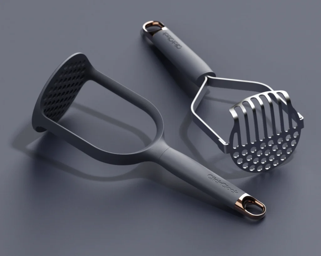 Plastic kitchen tools are often dismissed as cheap and cheerful. We saw an opportunity to rewrite that story. By combining common materials like nylon with considered surfacing and detailing, we delivered tools that look and feel far beyond their cost. The tactile matte finish contrasts with polished accents, while the decorative metal end cap adds a luxe touchpoint that catches both light and attention.